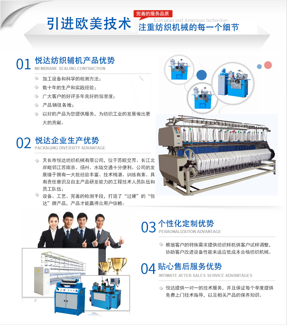 公司是主要生產(chǎn)紡織平車安裝工具、紡部輔件及配件綜合性企業(yè)。已有二十多年的生產(chǎn)歷史,在激烈的市場競爭中始終保持優(yōu)良的質(zhì)量、優(yōu)化的價(jià)格、齊全的品種優(yōu)勢。產(chǎn)品暢銷全國各地,深受新老客戶的好評。